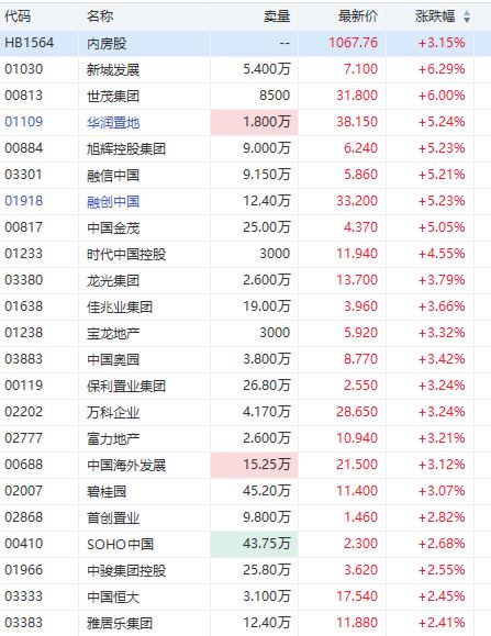 内房股今日集体走高,成分股中,新城发展涨超6%,领涨板块。世茂集团、华润置地、融创中国等热门股皆涨超5%。