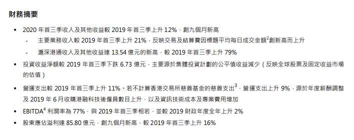 - 主要业务收入较 2019 年首三季上升 21%,反映交易及结算费因标题平均每日成交金额2创新高而上升