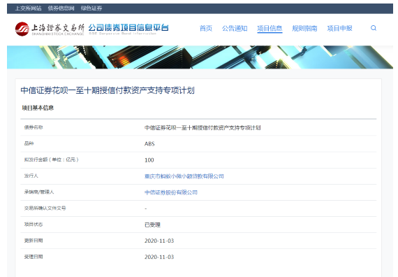《小贷新规》出台后,11月3日,重庆市蚂蚁小微小额贷款有限公司还有一项中信证券花呗一至十期授信付款资产支持专项计划已受理,拟发行金额为100亿元。