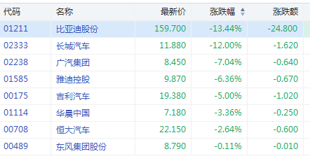 汽车股集体回调:比亚迪股份跌13% 长城汽车跌12%