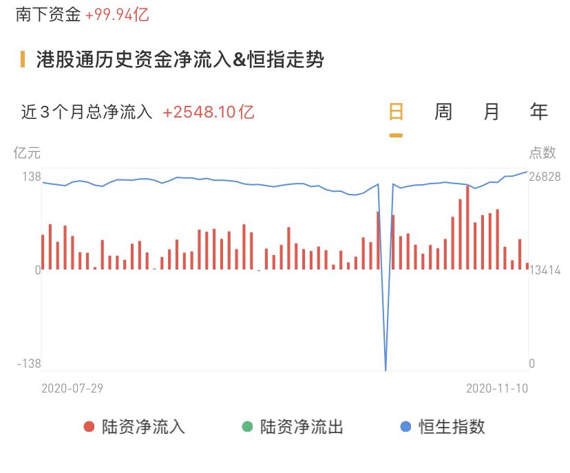 南下资金今日流入港股99.94亿港元,相比于前一日的9.14亿港元,规模大幅增加。