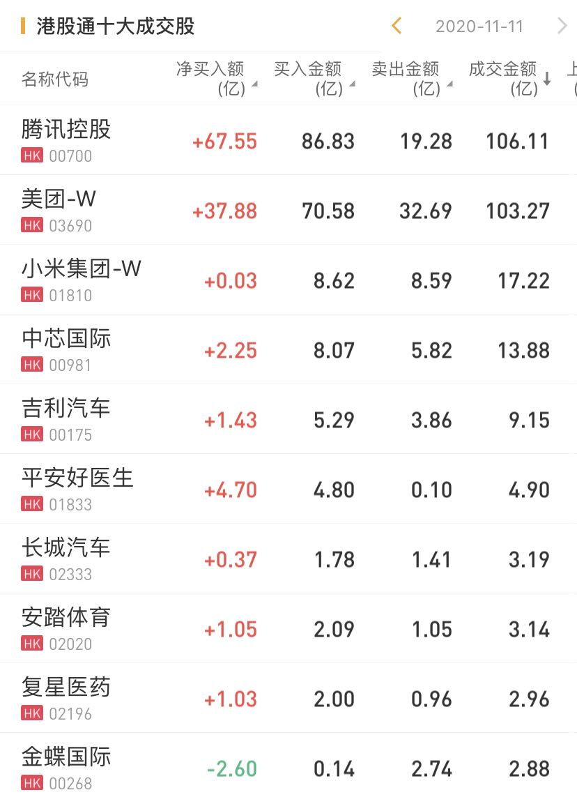 个股方面,今日南下资金净买入腾讯控股67.55亿港元,净买入美团37.88亿港元,净买入平安好医生4.7亿港元。此外,南下资金净卖出金蝶国际2.6亿港元。
