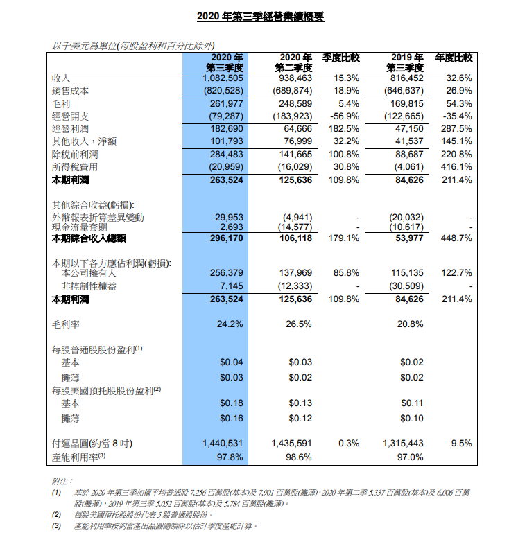 11月11日消息,中芯国际11月11日晚在港交所公告,第三季度收入10.8亿美元;第三季度净利润2.564亿美元,同比增122.7%。预期第四季度收入环比减少10%-12%,全年收入增长预期上修为24%-26%。