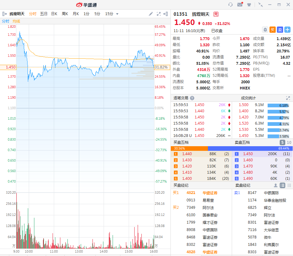 华盛资讯11月11日讯,辉煌明天(01351.HK)收涨31.82%,报价1.45港元,全日最高价1.77港元,最低价1.32港元,最新总市值7.25亿,一手盈利700港元。