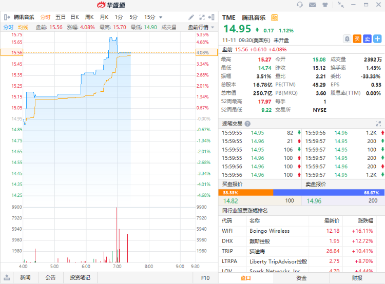 11月11日(周三)美股盘前,截至北京时间19:58,腾讯音乐(TME.US)涨4.08%,报15.7美元。