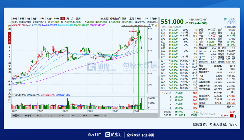 腾讯和阿里也跌得惨烈。腾讯两天从633跌到551,跌幅13%,蒸发7800亿市值。