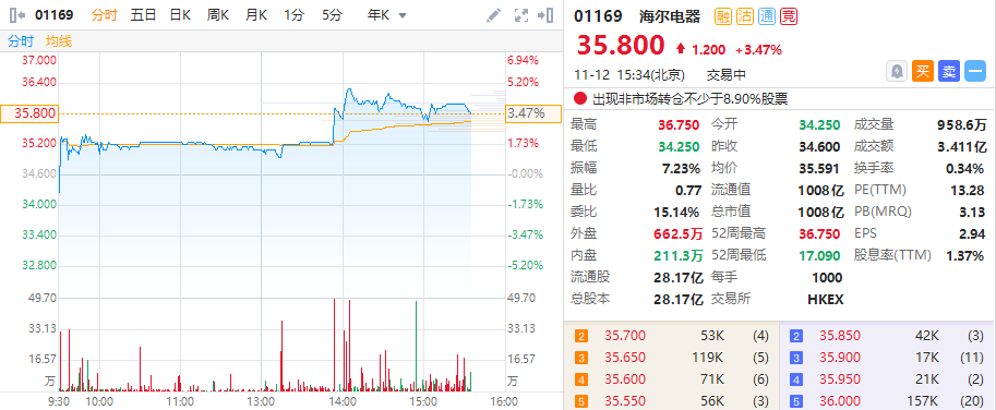 双十一大战落幕,海尔电器(01169)今日迎来历史新高。午后股价迅速攀升,最高见36.75港元。现涨幅收窄至3.47%,成交额达3.411亿,总市值超千亿。