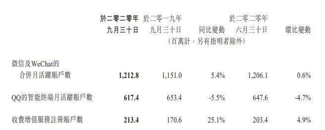 财报显示,三季度末微信及WeChat的合并月活跃账户数12.128亿,同比增5.4%;QQ的智能终端月活跃账户数6.174亿,同比下滑5.5%。