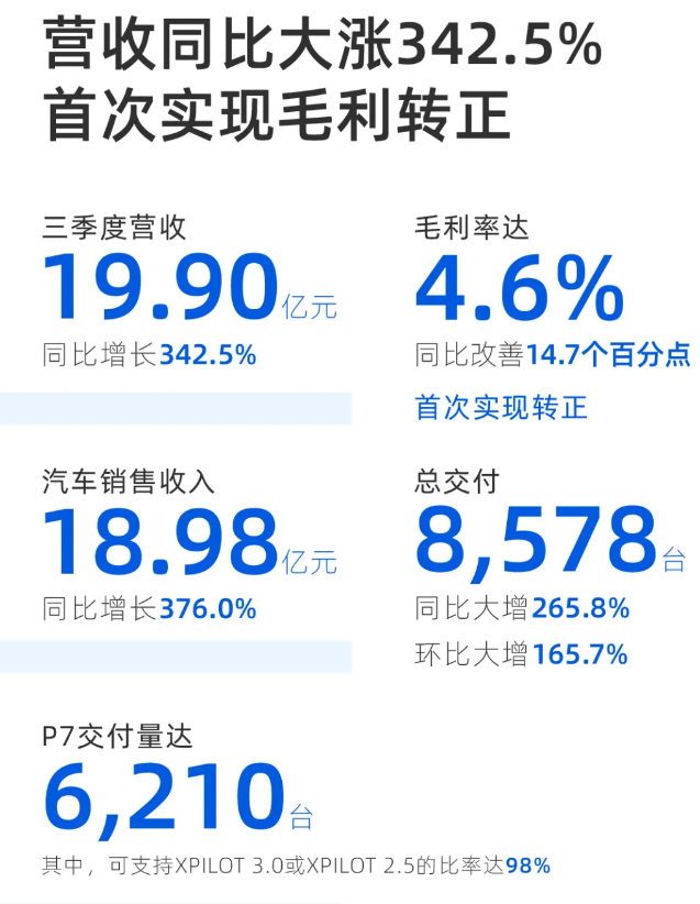小鹏汽车上市后首份财报:Q3总收入同比增342.5%,首度实现毛利转正