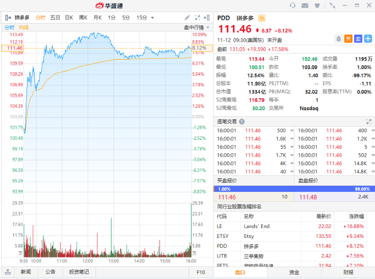 截至美股周三收盘,拼多多股价报收于111.46美元,总市值约1334.87亿美元。今天美股盘前交易中,截至发稿,拼多多股价涨幅达16.64%。