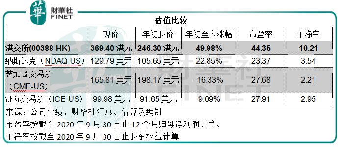 2020年前三个季度,这家交易所的累计收入及其他收入合共为140.91亿港元,同比增长12.1%;EBITDA同比增长12.6%,至108.83亿港元;股东应占纯利同比增长15.8%,至85.8亿港元。与国际级交易所比较