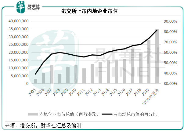 所以,这四家上市交易所各有特色、各有优势,但是从上表可以看出,港交所的估值胜出一筹,反映资本市场对港交所的信心更足,或更确切地说,对中国经济充满信心,从下图可见,在港交所上市的内地企业市价总值占市场总市值的百分比逐年提高,目前已达81.2%。