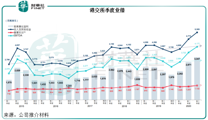 这家建基于香港的上市交易所刚刚公布了再创纪录的季度业绩。2020年第3季总收入同比增长38.3%,至46.26亿港元;包括投资收益在内的收入及其他收益同比增长33.2%,至53.09亿港元;EBITDA(扣除利息、税项、折旧及摊销前盈利)同比增长37.5%,至41.77亿港元。