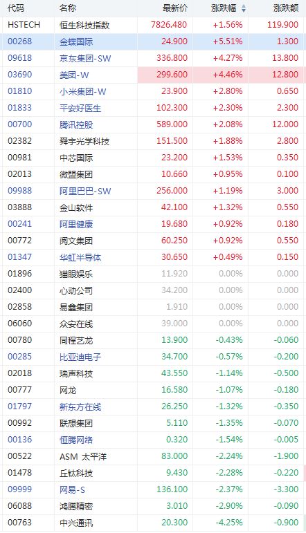 金蝶国际涨超5%,领涨指数成分股;京东、美团涨超4%;小米涨2%、腾讯、平安好医生涨2%;舜宇光学、阿里巴巴涨1%