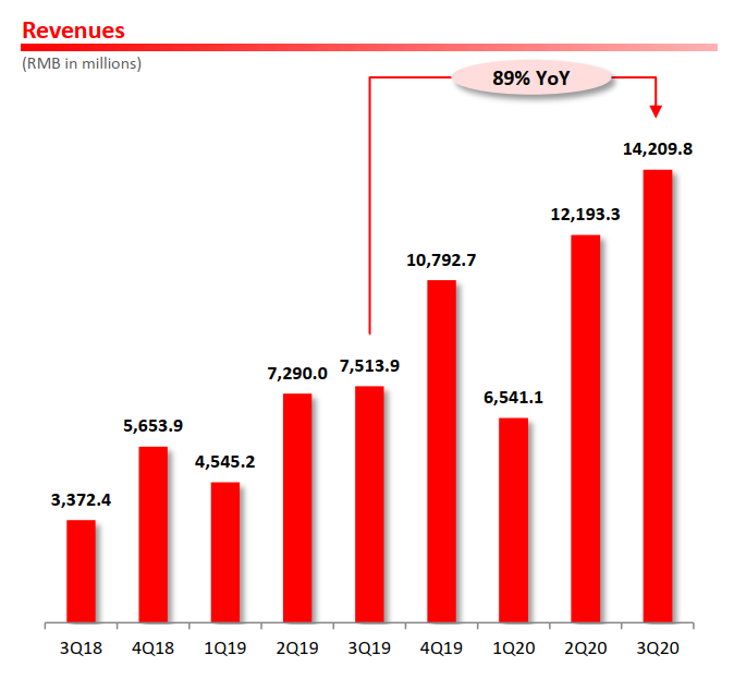 首先我们来看看拼多多的三季度财报,在2020Q3拼多多实现营收为142.1亿元,较去年同期增长89%,此前华尔街一致性预期为营收18.6亿美元,同比增77.1%,所以这一次拼多多三季报营收可以说大超市场预期。