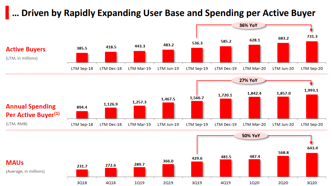 除此以外我们再看看经营数据,在2020Q3拼多多平台年度活跃买家数达7.313亿,同比增长36%。第三季度单季增长了4810万,环比增长7%。