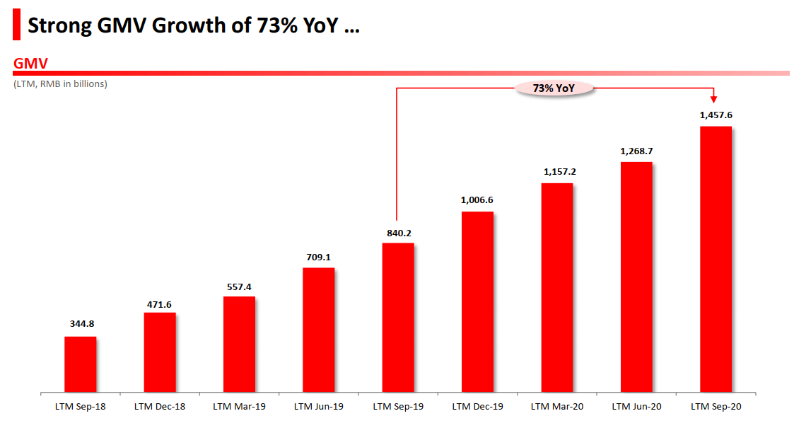 GMV(平台交易金额)方面,在截至2020年9月30日的前12个月里,拼多多GMV达1.46万亿元,相较去年同期的8402亿美元提升73%。