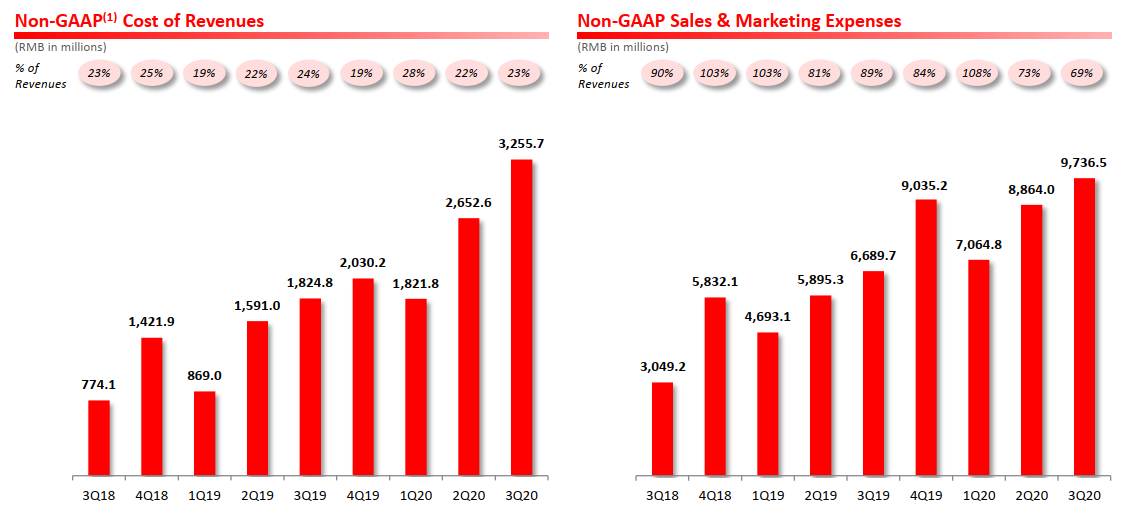 2020年Q3拼多多的经调整销售费用为97.37亿元人民币,占比总收入下降到了69%,而在去年同期这个比例还是89%。