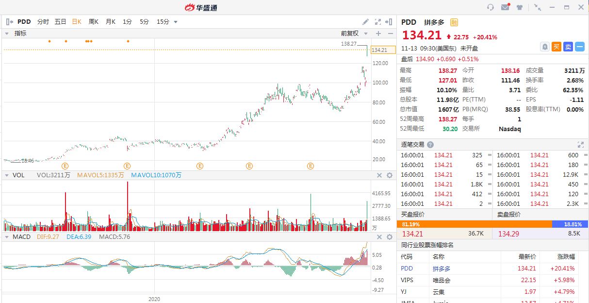 截至11月13日收市,华盛通APP发现拼多多市值已经高达1607亿美元,一夜之间市值飙升了268.9亿美元,折合约1780亿元人民币。而回溯过去,拼多多在2018年7月上市之初发行价仅为19美元,如今2年多时间过去实现了累计涨幅606.4%的壮举!