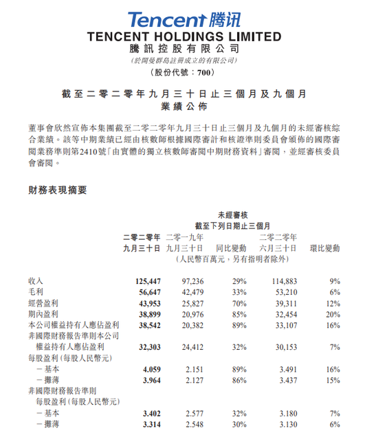 腾讯控股公布业绩,第三季度营收1254.5亿元,同比增29%;净利润385.4亿元,同比增89%。增值服务业务收入同比增长38%至人民币698.02 亿元。网络游戏收入增长45%至人民币414.22亿元,《王者荣耀》庆祝五周年之际,2020年首十个月的平均日活跃账户数超过1亿。金融科技及企业服务业务收入同比增长24% 至人民币332.55 亿元。网络广告业务收入同比增长16%至人民币213.51 亿元;第三季度微信及WeChat的合并月活跃账户数为12.128亿,去年同期为11.51亿;收费增值服务账户数同比增长25%至2.13亿。