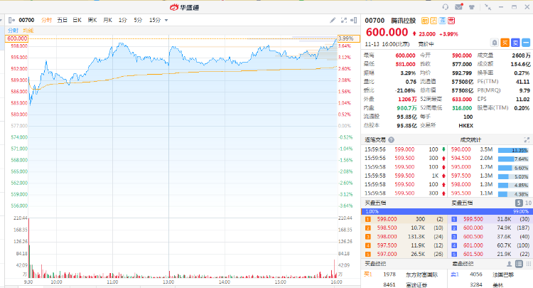 11月13日消息,腾讯第三季度净利润增89%,尾盘收复600港元关口,现涨近4%。
