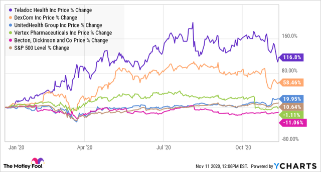 与市场其他板块相比,今年医疗保健行业的股票表现的很出色。许多医疗保健股已经持平或超过了标准普尔500指数的涨幅。鉴于医疗行业中公司提供的重要产品和服务,包括救生药物和医疗设备到保险和潜在的疫苗,该行业的许多股票保持衰退和波动性也就不足为奇了。