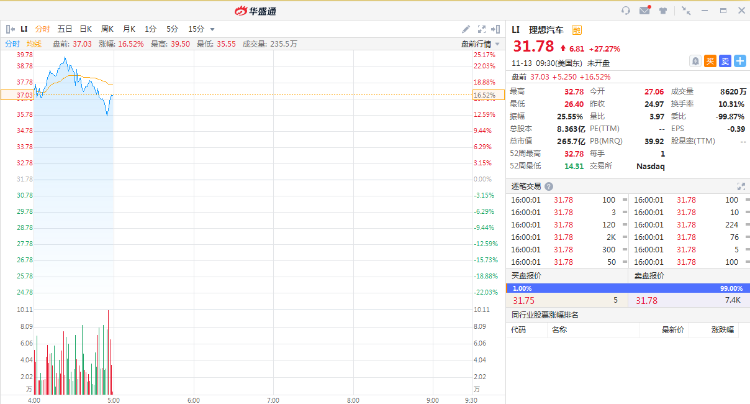 财报发布后,理想汽车盘前股价回落至16%,曾一度涨超20%。