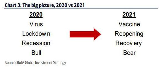 美国银行预计,在有疫苗问世以前,投资者可能会对周期股和保守的大盘科技股并举。其认为,今年的主题是新冠病毒、停工封锁、经济衰退,而明年是疫苗、复工和经济复苏。两相对比,今年看涨,明年看跌。