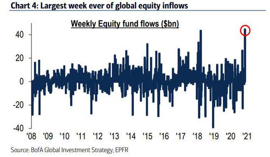 美国银行的新近报告显示,截至11月11日本周三的一周内,流入全球股票基金的资金累计约有445亿美元,创美银有统计纪录以来单周流入股市最高规模。其中,335亿美元流入美股,为第二高单周流入额;新兴市场股市流入65亿美元,为第六高流入额。