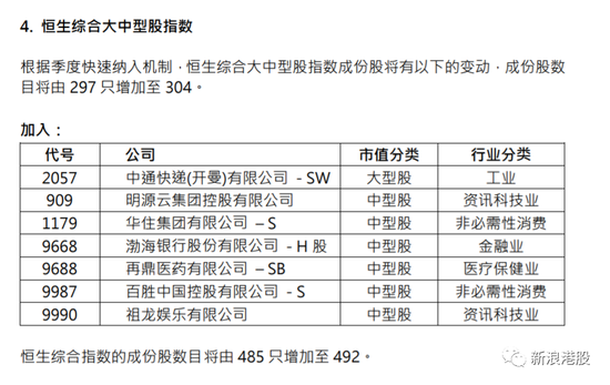 此外,根据季度快速纳入机制,恒生综合指数成份股将有485只增加到492只。明源云、渤海银行、祖龙娱乐有望纳入港股通。而第二上市的中通快递、华住集体、百胜中国、再鼎医药暂时或无法纳入。