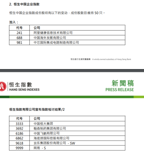 恒生指数公司发布季度检讨结果,国企成份股纳入9只股票,阿里健康、中芯国际、中海外、中国恒大、翰森制药、中国飞鹤、海底捞、京东、网易获纳入。