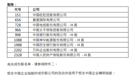 中国旺旺、复星国际、中国电信、中国太保、中国神华、中信银行、民生银行、万科企业、中国人保遭剔除。