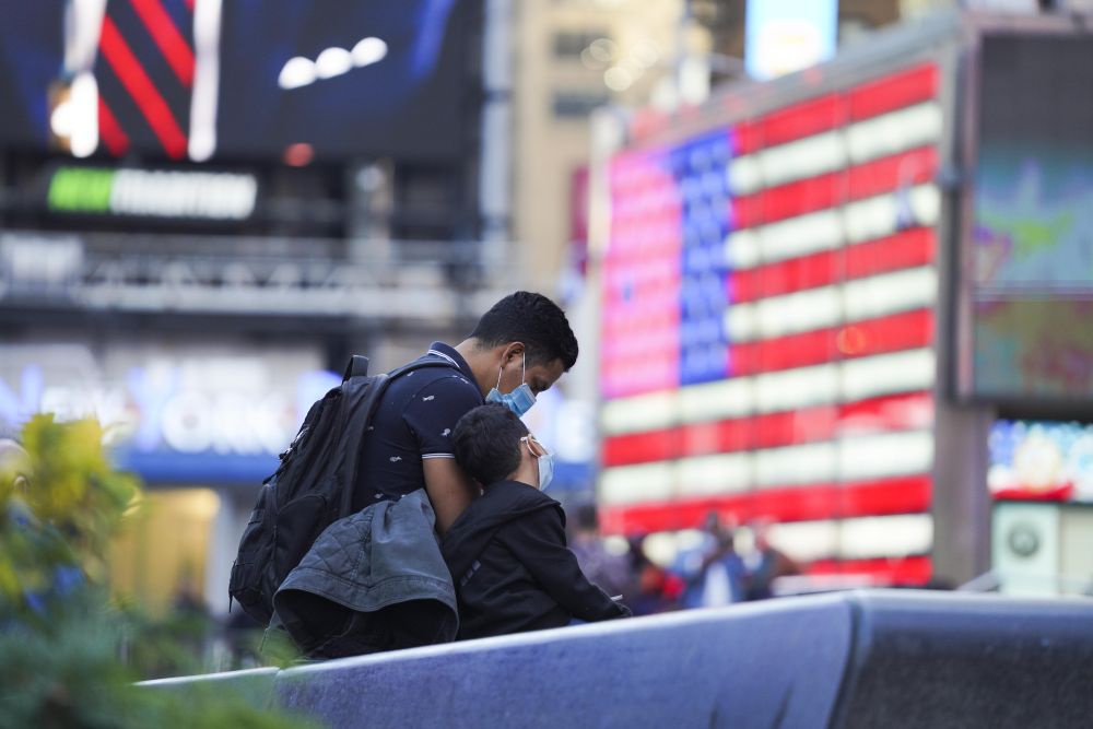 11月9日,在美国纽约,一对父子在时报广场上休息。新华社记者王迎摄