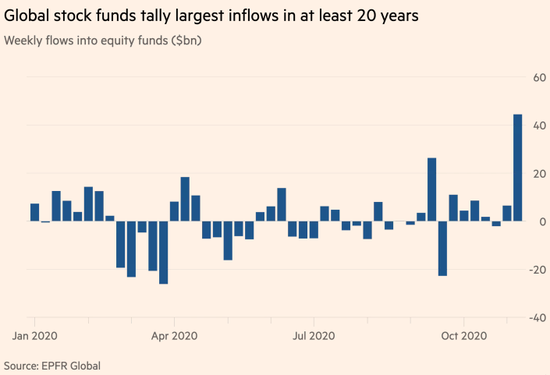 在辉瑞宣布其在新冠肺炎疫苗上取得突破后,这一消息刺激了金融市场。在随后的几天内,投资者向全球股票基金投入的资金超过了至少20年来的任何一周。