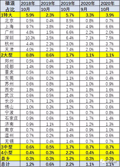 2020年插混市场在全国各地市场占比都持续增长,尤其在限购城市,插混车市场占比达到3%,全国插混也达到1%的最高水平,