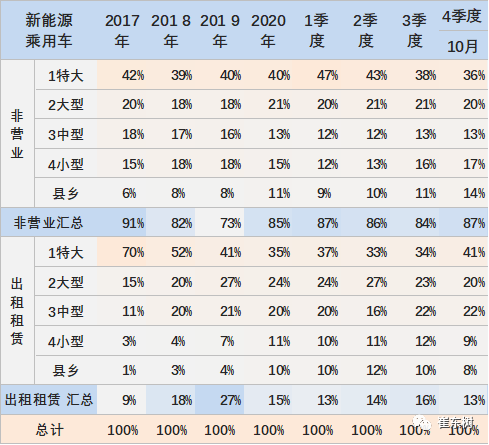 纯电动的租租赁市场目前表现逐步的回暖,2019年出租租赁占纯电动车销量32%,2020年出租租赁的占比达到17%,其中三季度表现回归到20%左右水平,。