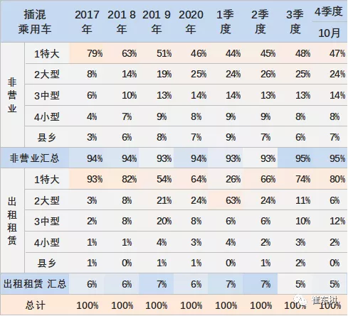 插电混动车型的出租租赁占比相对稳定,近一段段时间占比始终在7%左右的比例,. 出租租赁车型,主要的需求在特大城市和大型城市市场,今年的大型城市市场插混出租表现相对突出。