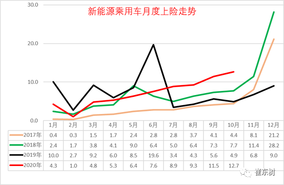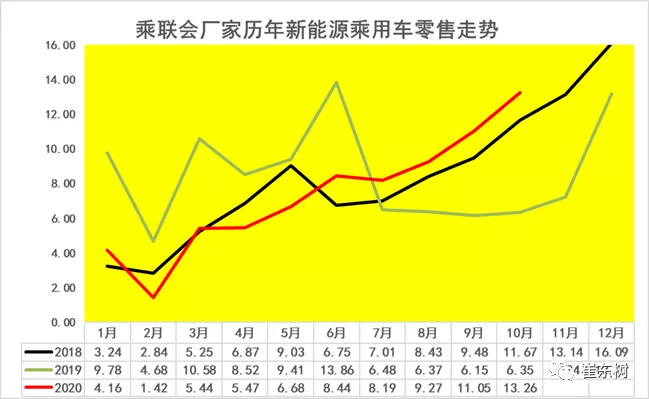 从乘联会的零售数据看,2020年10月份,今年乘车零售达到13万台,相对于19年10月份的走势大幅提升,但是相对18年10月份的走势表现还是一致的,走势很不错的.目前走势与18年类似,但主要是需求因素,体现新能源乘用车还是有一定需求的。