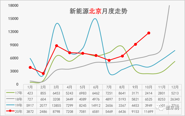 北京市场2020年新能源车市场走势相对较强,10月销量达到9千台。进度较慢,部分消费者购车相对谨慎。
