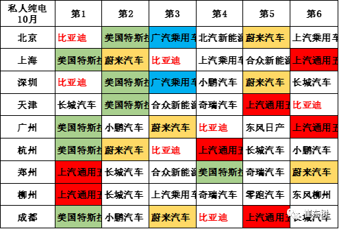 私人纯电动市场的特色相对鲜明,高端化趋势极其明显,除了北京是比亚迪表现优秀,天津市的长城,柳州市上汽通五菱,其他地区大部分都是在市场低迷期的。