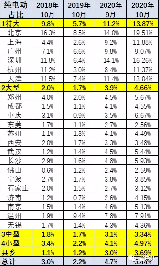 新能源乘用车主要在限购特大城市需求较强,2020年纯电动乘用车在特大城市,占到总销量42%,较2019年提升3个百分点,这也是说明限购城市的纯电动车市场需求较为综合全面。