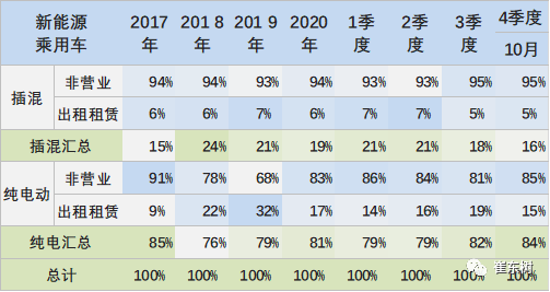 新能源乘用车的出租租赁类占比逐步提升。纯电动2020年租赁的占比相对2019年同期稍有下降。