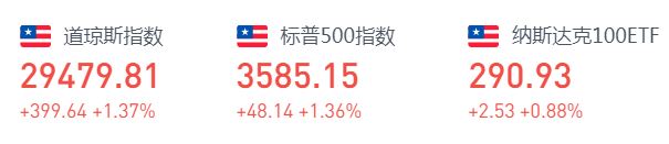 上周五收盘,标普500指数涨48.10点,涨幅1.36%,报3585.15点;纳斯达克指数涨119.70点,涨幅1.02%,报11829.29点;道琼斯指数涨399.60点,涨幅1.37%,报29479.81点。