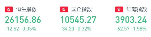 上周五收盘,恒生指数跌12.52点或0.05%,报26156.86点,全日成交额达1514.07亿。国企指数跌0.32%,报10545.27点,红筹指数跌1.58%,报3903.24点。