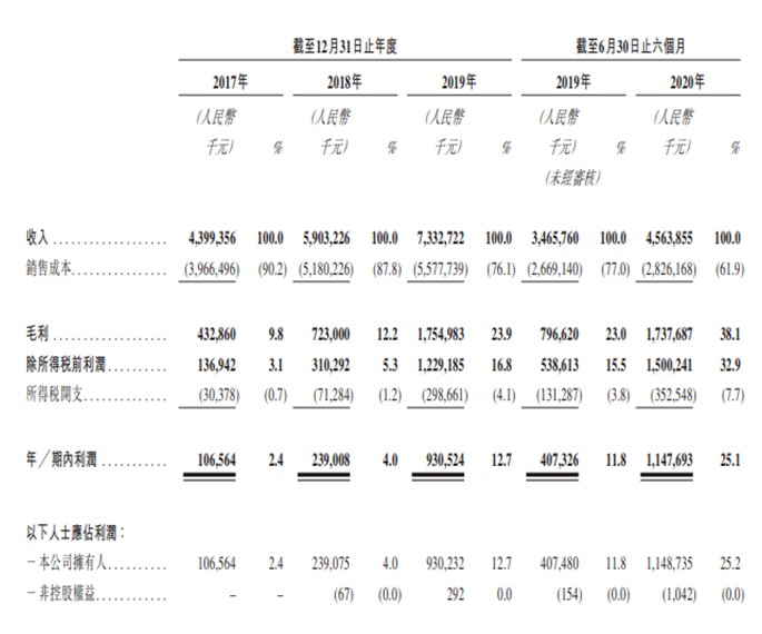 于往绩记录期,该公司的优质服务带来稳健经营业绩。于2017年、2018年及2019年以及截至2020年6月30日止六个月,该公司的收入分别为人民币43.994亿元、人民币59.032亿元、人民币73.327亿元及人民币45.639亿元;该公司的净利润分别为人民币1.066亿元、人民币2.39亿元、人民币9.305亿元及人民币11.477亿元。