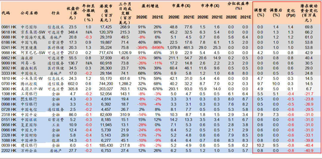 图表:恒生指数调整与潜在被动资金流向测算(数据截止2020年11月13日,预测值为Bloomberg一致预期)
