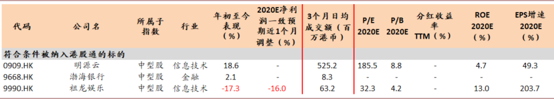 根据指数公司公布的恒生综指的调整情况,并结合港股通纳入的额外要求,明源云、渤海银行、祖龙娱乐这三家公司可能符合被纳入港股通投资范围的条件;不过,中通快递-SW、华住集团-S、再鼎药业-SB、百胜中国-S,由于是二次上市(-S)或未盈利生物科技公司(-B),因此尚不符合沪港通纳入标准。