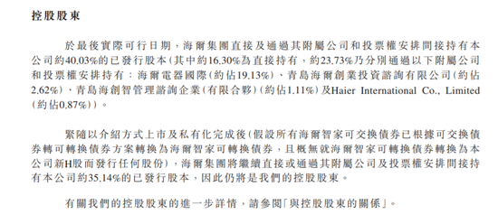 于最后可实行日期,海尔集团直接或间接持有公司30.03%的股权,紧随介绍方式完成后,海尔集团依然持有公司35.14%股权,为公司控股股东。