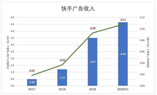2020年H1,每日用户在线总时长为1.88亿小时,每小时在线时长对应广告收入0.11元,2019年这个数字是0.09元。#用户刷一小时,快手赚1毛1广告费#