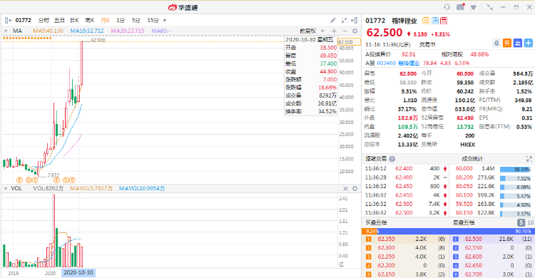 11月16日消息,赣锋锂业直线拉升,现涨5.31%,报62.5港元,股价创历史新高。